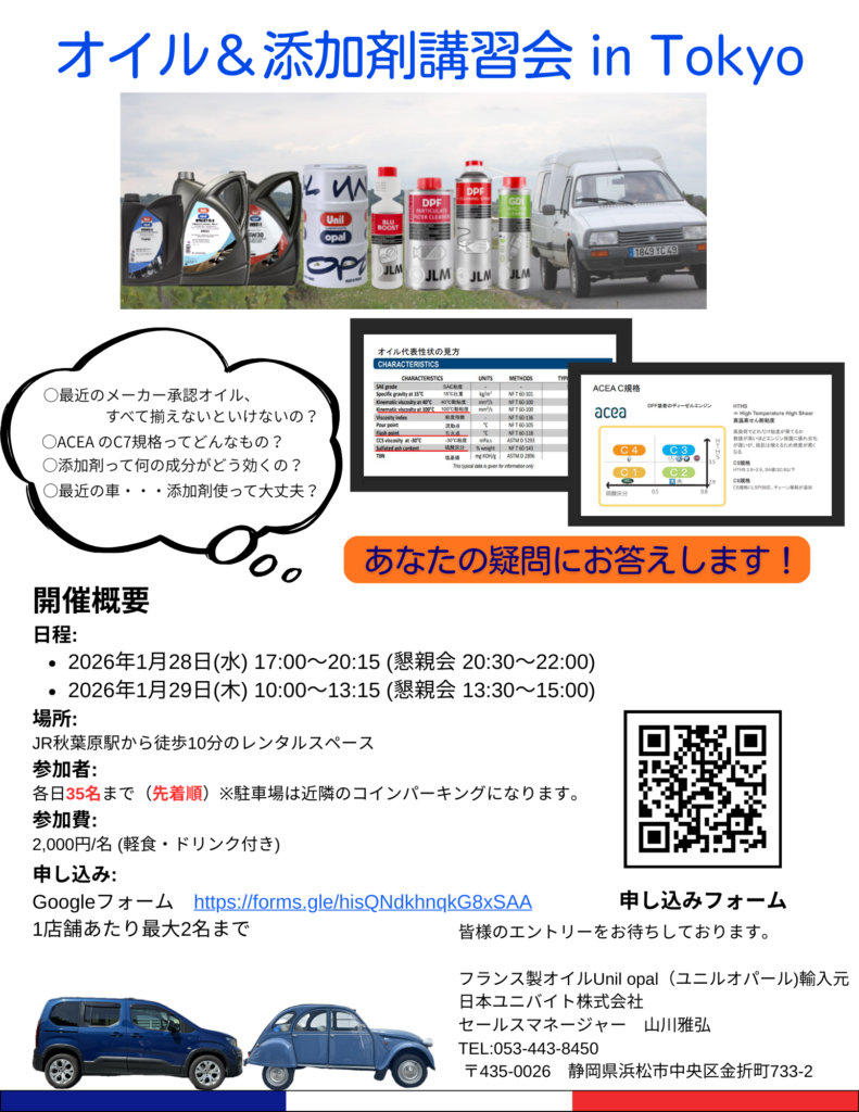 2026年は全国数か所でオイルと添加剤の講習会を開催します!